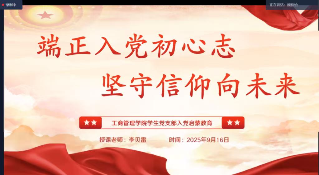 为深入学习贯彻习近平新时代中国特色社会主义思想,帮助2025级新生扣好“思想成长的第一粒扣子”,引导青年坚定理想信念,树立正确入党动机,主动向党组织靠拢。工商管理学院学生党支部于2025年9月16日开展“端正入党初心志,坚守信仰向未来”新生入党启蒙教育专题课。本次党课由工商管理学院党总支组织员李贝雷主讲,2025级全体新生参加。
