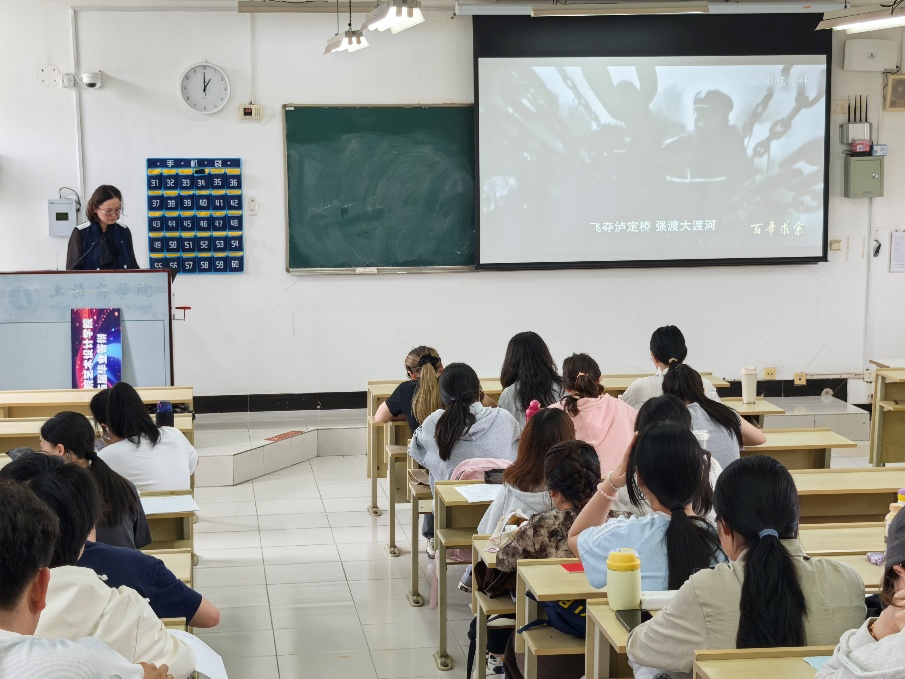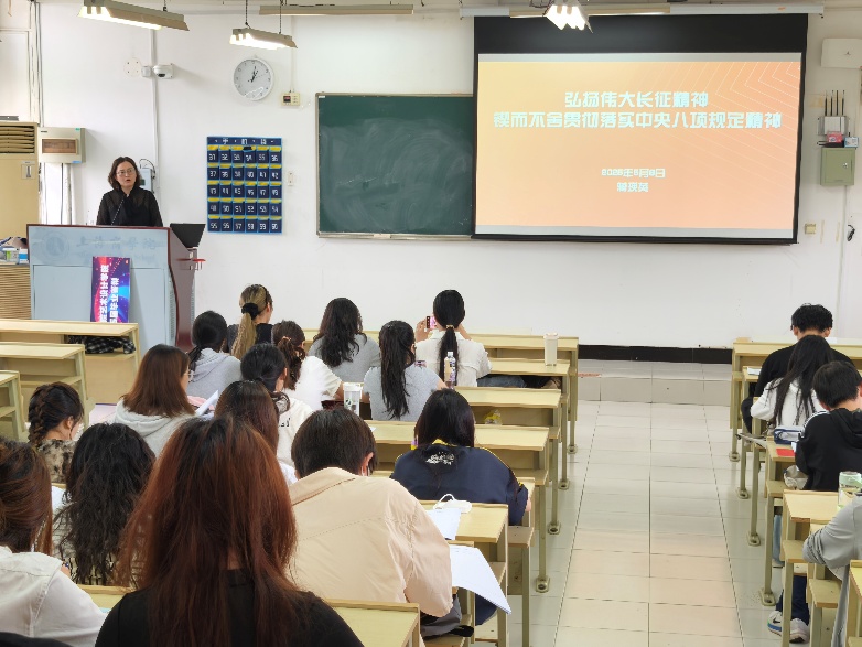 为扎实推进深入贯彻中央八项规定精神学习教育,持续深化作风建设,进一步提升学生的党性纪律修养,端正入党动机,2025年5月6日,艺术设计学院、工商管理学院、商务经济学院分党校第三期入党积极分子培训班第三讲在2号楼506展开。本次培训主题为“弘扬伟大长征精神 锲而不舍贯彻落实中央八项规定精神”,主讲人为上海健康医学院组织部副部长蒋瑛英。