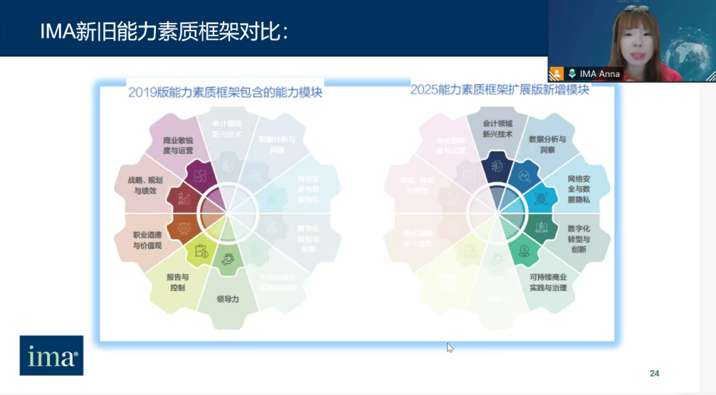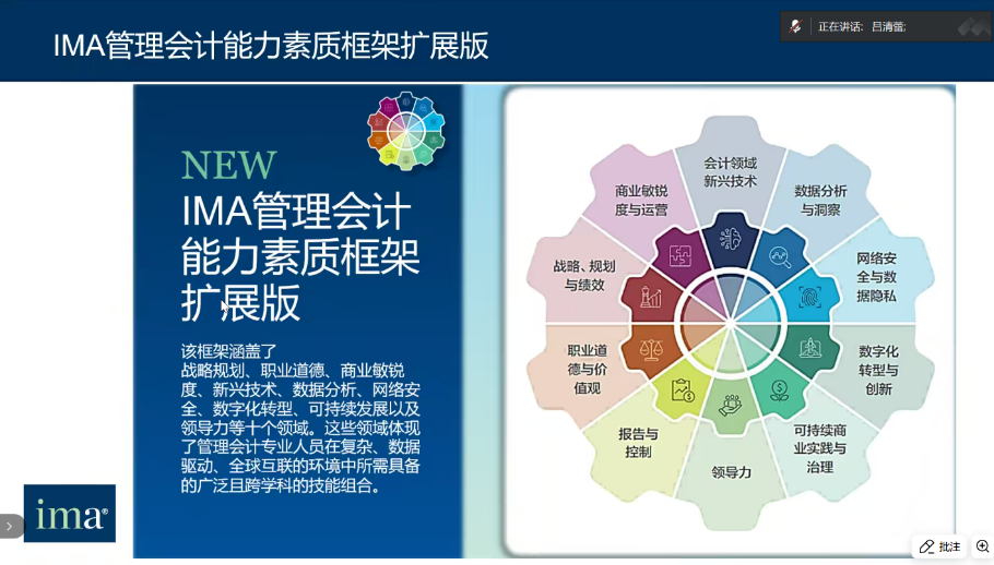 随后,IMA协会代表Anna详细介绍了IMA协会的历史、全球影响力及其在中国的布局。她强调,IMA协会一直致力于推动管理会计的发展,推出了管理会计能力素质框架,并与多家知名企业建立了战略合作关系,为学生提供了丰富的实习和就业机会。Anna重点解读了管理会计能力素质框架,强调其涵盖职业道德、领导力、技术与分析等模块,尤其纳入人工智能、区块链等前沿内容,契合数字化时代对财务人才的新要求。