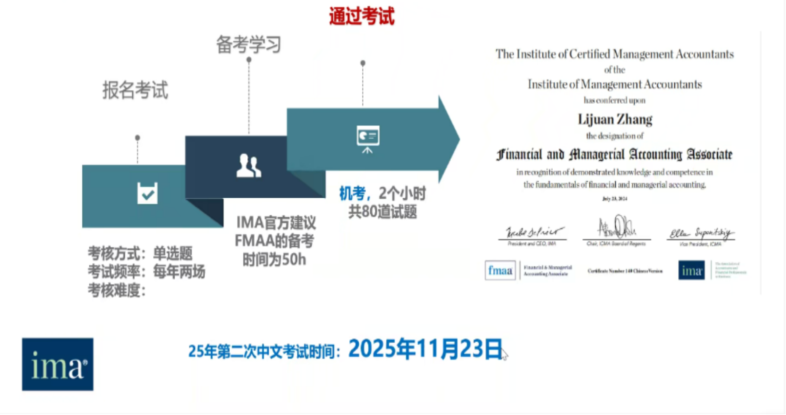而后,IMA协会代表周祥Jack介绍了IMA协会提供的各类支持性政策和资源。他提到,IMA协会为学生提供了丰富的奖学金计划和校园大使项目,帮助学生提升职业竞争力。他还详细介绍了FMAA证书的考试安排和报名信息,鼓励大家积极备考,提升自身专业能力。