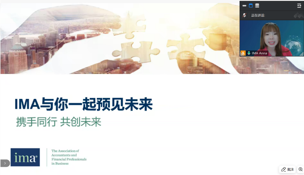 2025年9月23日下午,美国管理会计师协会(IMA)与上海商学院工商管理学院联合主办的“IMA与上海商学院财务管理专业2025年秋季开学第一讲”通过腾讯会议顺利举行。本次讲座聚焦财务管理专业的转型与挑战、职业能力框架、行业认证体系及实习就业支持等内容,为财务管理专业学生带来一场内容丰富、视角前沿的开学第一课。由工商管理学院丛海涛老师主持,IMA协会代表Anna、周祥Jack、吕清蕾等嘉宾以及财务管理专业全体学生共同参与。