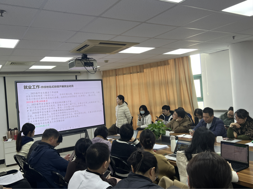 会上,学院党总支副书记、副院长蒋苏首先结合调研数据,全面通报2025届毕业生就业工作整体成效与不足。并针对2026届毕业生就业工作,从筹备、强化、冲刺、收尾四个阶段节点作出部署。