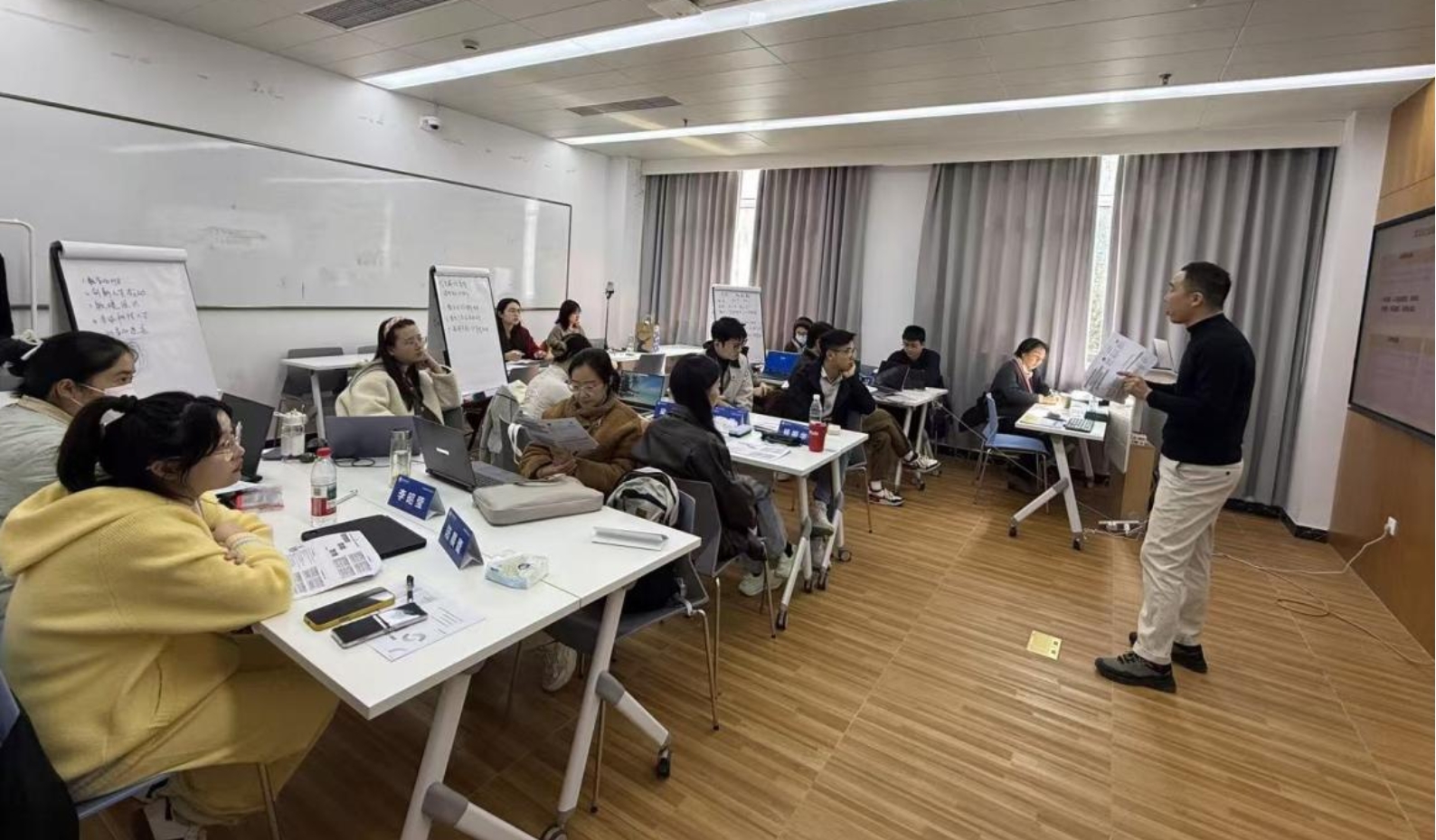 课堂上,MBA学子以小组为单位,围绕真实企业场景展开研讨,运用课程工具拆解战略落地中的人力资源核心问题,研讨适配方案与实施路径。娄振宇先生全程参与各组交流,对分析框架、逻辑思路、方案落地给予精准指导,及时答疑解惑,帮助学员完善思考、形成专业系统的解决方案。现场思维碰撞、氛围热烈,有效提升了学员的问题分析、团队协作与方案制定能力。