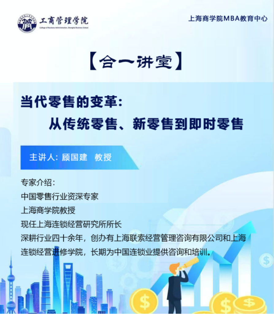 为深化MBA学员对行业变革逻辑与未来趋势的认知,2025年12月25日,上海商学院MBA合一讲堂正式启幕,首期活动特邀上海连锁经营研究所所长顾国建教授开展专题讲座,本次活动紧扣“知行合一”核心宗旨,以专业深度赋能实践能力,为在场MBA学子带来了一场兼具历史深度、行业广度与实践价值的思想盛宴。